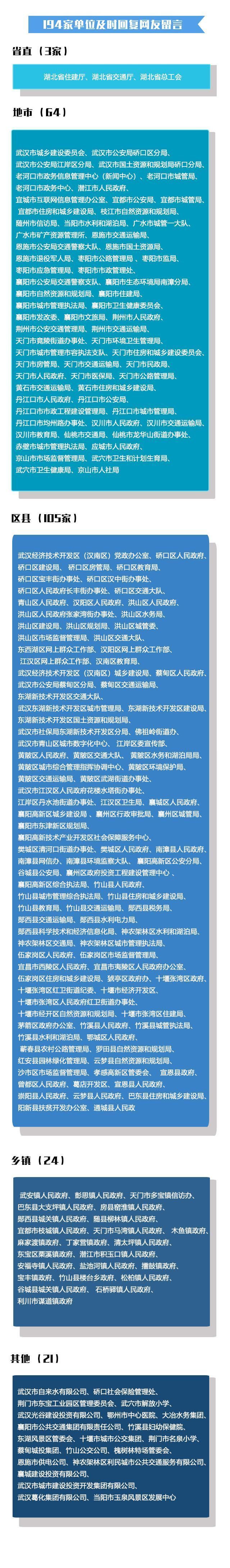 湖北省內各入駐單位及時回復網友留言,響應群眾關切,欄目組代表廣大網友表示誠摯感謝!同時,因各種原因,還有部分留言沒有得到及時回復,如有回音,請在《民生熱線》《荊楚問政》中及時給予回復。