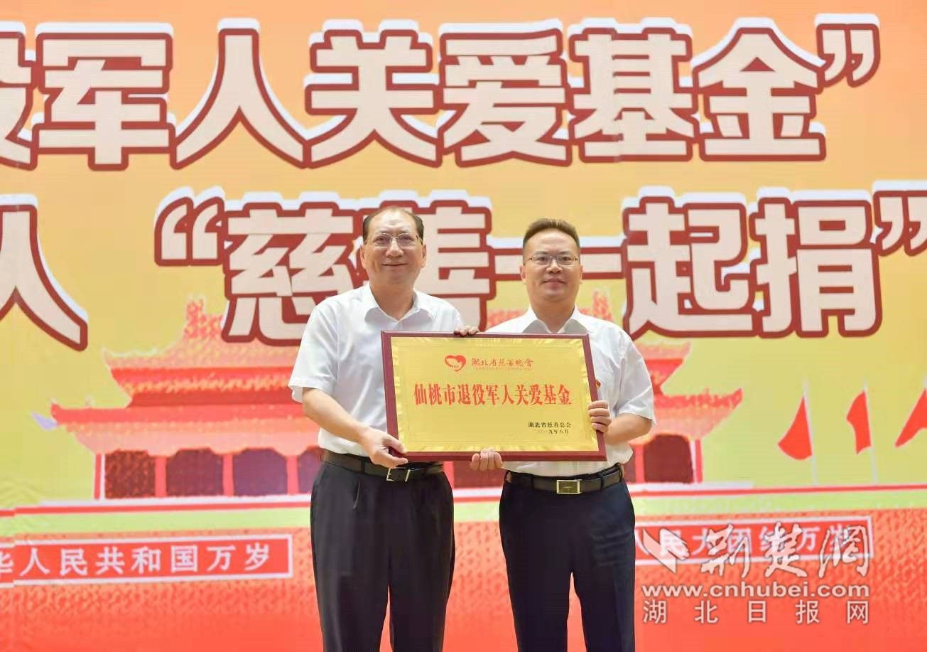 仙桃市委書記胡玖明為“仙桃市退役軍人關愛基金”授牌。通訊員供圖。