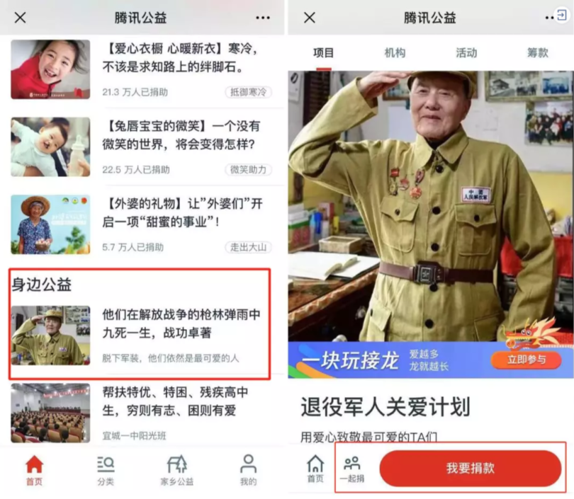 第一步:手機點擊鏈接https://ssl.gongyi.qq.com/m/weixin/detail.htm?et=dtlfx&pid=213739或打開微信小程序“騰訊公益”,點擊“退役軍人關愛計劃”,參與“99公益日”活動,捐贈善款。