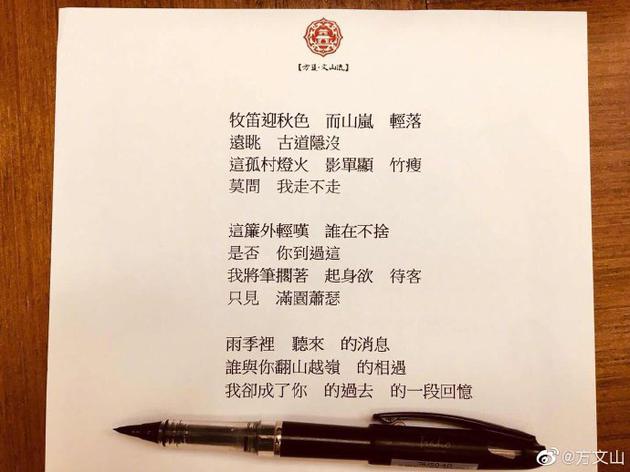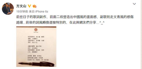 網(wǎng)易娛樂9月11日報道 9月11日,方文山在微博分享了自己創(chuàng)作的一段歌詞,并配文:“前些日子的歌詞創(chuàng)作,前面二段營造出中國風(fēng)的畫面感,副歌則走文青風(fēng)的感傷路線...前后的詞風(fēng)轉(zhuǎn)換還蠻特別的,在此與網(wǎng)友們分享。”