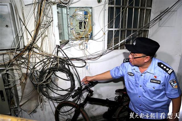 專班民警隨后進(jìn)入一棟居民樓內(nèi),發(fā)現(xiàn)居民樓一樓底層樓梯間內(nèi)電線密密麻麻,如蛛網(wǎng)一般,且通風(fēng)不暢,不利于散熱,于是當(dāng)場(chǎng)責(zé)令物業(yè)部門連夜進(jìn)行整改,消除安全隱患。