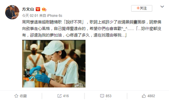 網(wǎng)易娛樂9月17日報道 16日晚,周杰倫發(fā)布新歌《說好不哭》引發(fā)熱議。17日凌晨,方文山在微博發(fā)文表示:“周同學(xué)這首超耐聽情歌《說好不哭》,歌詞上或許少了些場景與畫面感,詞意偏向敘事走心風(fēng)格,自己覺得蠻合適的,希望你們也喜歡......‘你什么都沒有,卻還為我的夢加油,心疼過了多久,還在找理由等我’。”