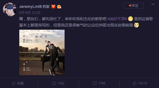 網(wǎng)易娛樂(lè)9月17日?qǐng)?bào)道 9月16日晚,林書豪曬出一張周杰倫新歌的封面,并配文寫道:“嘿,朋友們,都先別忙了,來(lái)聽聽我和杰倫的新歌吧,說(shuō)好不哭。雖然這首歌基本上都是我寫的,但是我還是很客氣的讓這位帥哥出現(xiàn)在封面前面。”照片上,林書豪坐在周杰倫身后的鋼琴上,創(chuàng)作人也加上了自己的名字,十分搞怪,但毫無(wú)違和感。