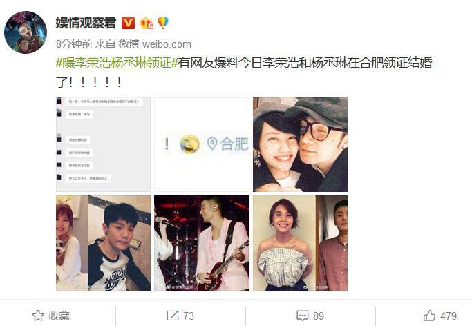 網(wǎng)易娛樂9月17日報道 9月17日,有合肥的網(wǎng)友爆料稱,李榮浩、楊丞琳在合肥領(lǐng)證完婚。據(jù)爆料網(wǎng)友,透露這個消息的,還是在民政局工作的朋友。據(jù)悉,李榮浩的家鄉(xiāng)正是安徽省合肥市。