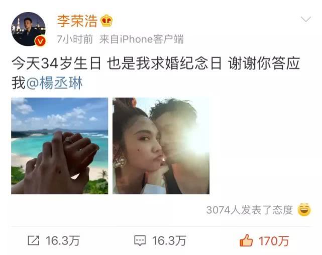 據(jù)悉,今年7月11日,在李榮浩的34歲生日當(dāng)天,他向楊丞琳求婚成功,還開心發(fā)文:“今天34歲生日,也是我求婚紀(jì)念日,謝謝你答應(yīng)我。”