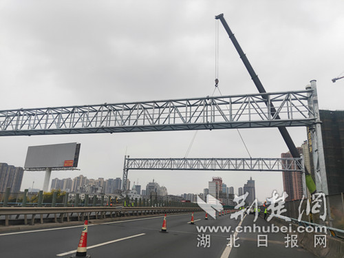 二廣高速荊州城區段K1759+078的ETC門架吊裝中 。