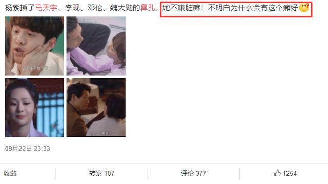 其實(shí)剛開始,網(wǎng)友們對(duì)楊紫插鄧倫鼻孔這件事都是可以接受的,畢竟是為了演戲,而且這個(gè)橋段確實(shí)挺有意思的,設(shè)計(jì)出來(lái)完全符合劇情。但是之后網(wǎng)友們又挖出《北京女子圖鑒》中魏大勛被楊紫插鼻孔的戲份,這才發(fā)現(xiàn)愛插男演員的鼻孔原來(lái)是楊紫的癖好。魏大勛飾演的男主問(wèn)楊紫飾演的女主要點(diǎn)啥吃的。然后楊紫就插魏大勛的鼻孔了,魏大勛被插鼻孔后馬上躲開了。