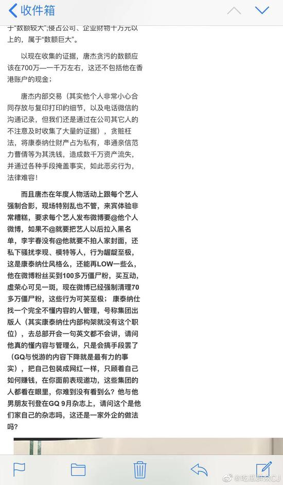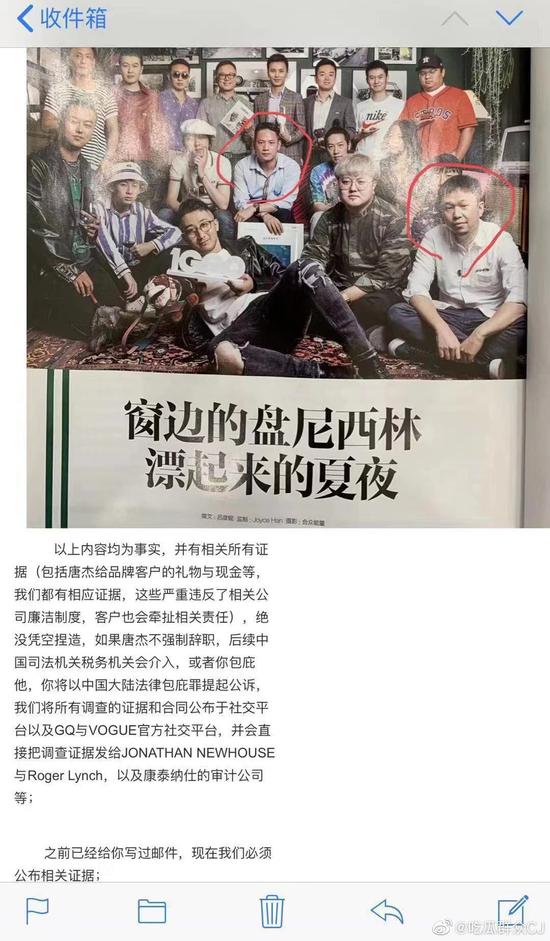 此外,郵件中還列出了唐杰在前段時(shí)間舉辦的GQ年度人物活動(dòng)上的種種行為,引發(fā)熱議,其中包括“跟每個(gè)藝人強(qiáng)制合影”,要求“每個(gè)藝人發(fā)布微博要@個(gè)人微博,沒有@就不拍封面”,其中李宇春因?yàn)闆]有@唐杰就不被拍封面,甚至還提到唐杰騷擾當(dāng)紅男星李現(xiàn)及其他模特等行為。該員工還斥責(zé)唐杰不懂內(nèi)容管理,不會(huì)英文,只會(huì)把自己包裝成網(wǎng)紅,還買僵尸粉為自己營(yíng)造人氣。據(jù)悉,該郵件還抄送給了各大奢侈品牌中國(guó)區(qū)高層,且郵件中稱如果唐杰不強(qiáng)制辭職,將會(huì)把所有調(diào)查證據(jù)和合同公布于社交平臺(tái)及GQ與VOGUE官方社交平臺(tái),以及審計(jì)公司等。