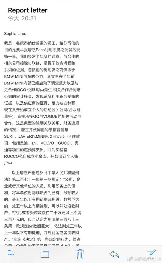 網(wǎng)易娛樂9月23日?qǐng)?bào)道 近日,網(wǎng)曝有一名GQ員工發(fā)郵件內(nèi)部舉報(bào)GQ運(yùn)營(yíng)總監(jiān)唐杰,郵件中稱“經(jīng)過半年多的調(diào)查,掌握了其貪污受賄的證據(jù)”,并稱“以現(xiàn)在收集的證據(jù),唐杰貪污的數(shù)額應(yīng)該在700萬(wàn)——一千萬(wàn)左右,還不包括他在香港的現(xiàn)金”。在郵件中,該員工指出唐杰與自己的男友及親信利用職務(wù)受賄,并將公司資產(chǎn)轉(zhuǎn)移到個(gè)人賬戶。