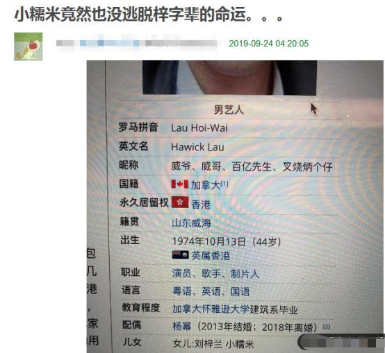 此次這位網友在曬出小糯米名字的時候,就調侃道:“小糯米竟然也沒能跳脫梓子輩”,通過資料顯示,我們可以清楚地看到,在劉愷威信息一欄中,在兒女一欄中寫著“女兒:劉梓蘭 ”,出生日期是2014年6月1日,通過出生年月可以判斷“劉梓蘭”確實是小糯米的大名。