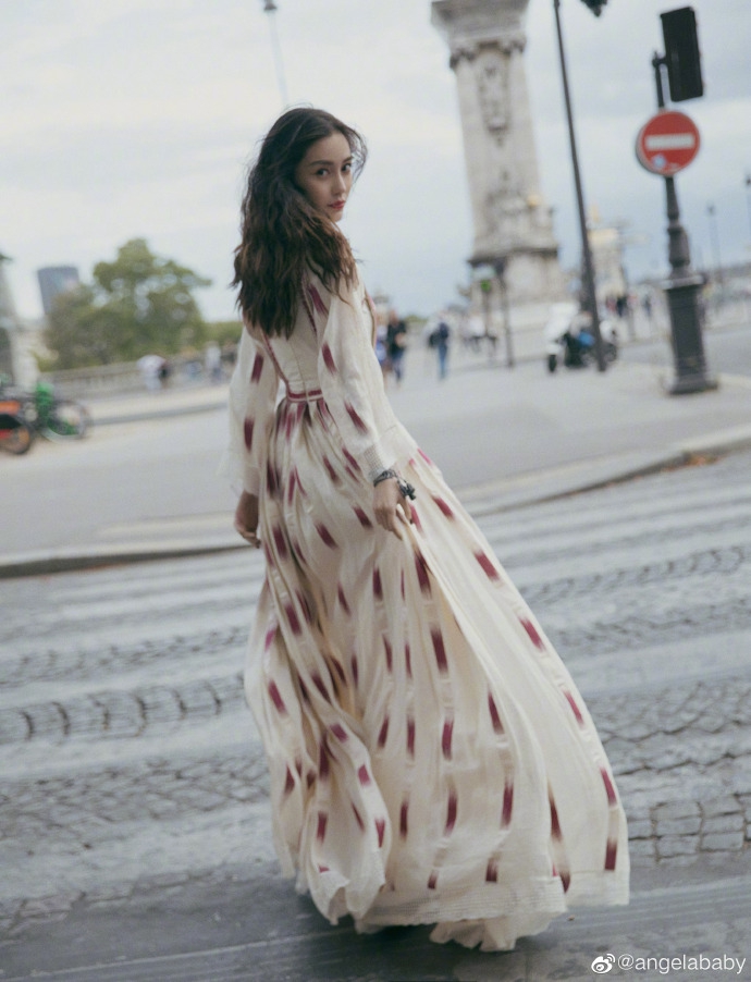 9月24日,angelababy在微博曬巴黎時裝周街拍照,并配文:“分享今日巴黎的風。”照片中baby卷發優雅,身穿印花長裙搭配皮衣復古優雅。隨后身穿該套服裝現身時裝周活動,叉腰撩發紅唇甜美而不失氣場。