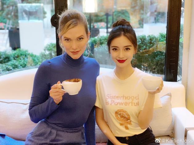 網易娛樂9月25日報道 9月25日,超模KarlieKloss曬出與Angelababy的合影,baby身穿白T,花苞頭搭配紅唇既少女又撩人,而小KK一身藍色高領衣,氣場強大,兩位同框喝咖啡的畫面十分養眼。