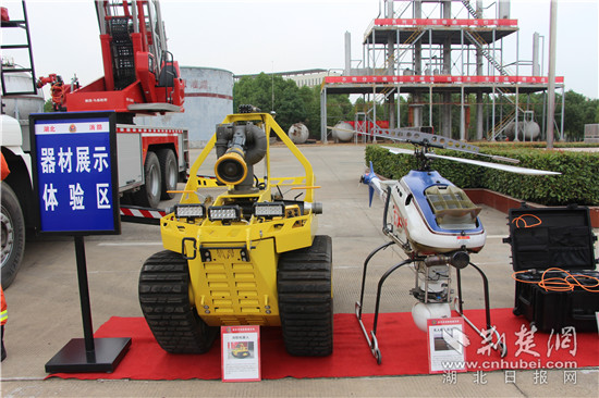 現場展示的滅火機器人、無人機等消防救援設備。記者張城攝