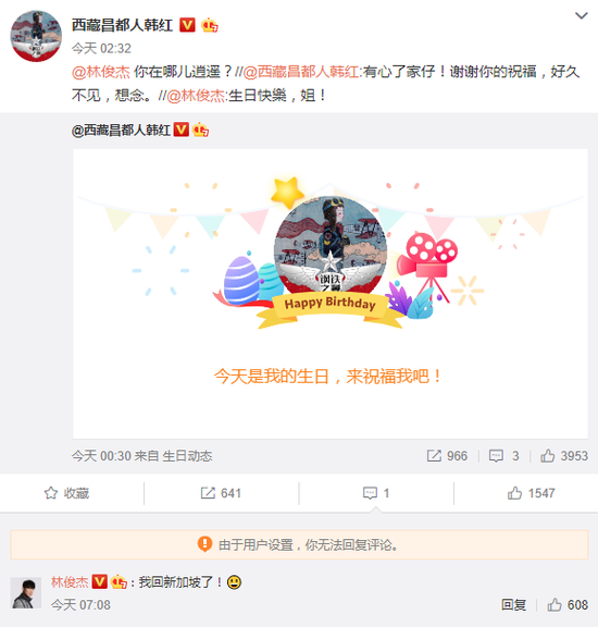 網易娛樂9月26日報道 9月26日是韓紅48歲的生日,林俊杰在微博評論里為其送上生日祝福:“生日快樂,姐!”,隨后兩人就在深夜開啟了一問一答模式。韓紅回復:“有心了家仔!謝謝你的祝福,好久不見,想念。”“你在哪兒逍遙?”接著林俊杰又回復:“我回新加坡了!”