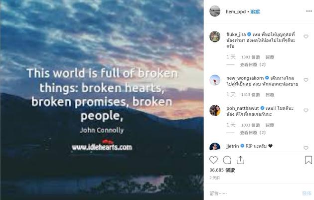 據(jù)泰媒報(bào)道,Hem演過多部當(dāng)紅電影和電視劇,包括《天使之戀》、《偷心俏冤家》、《致命尸錢》,日前剛參加新劇《金娜麗之紋》定裝照的拍攝工作,該劇由國民情侶檔Nadech、Yaya共同主演,尚未開拍已經(jīng)先轟動(dòng)。他在IG最后一則貼文,引用的是推理作家約翰康納利的話,臉書動(dòng)態(tài)影片也隱藏憂郁訊息。