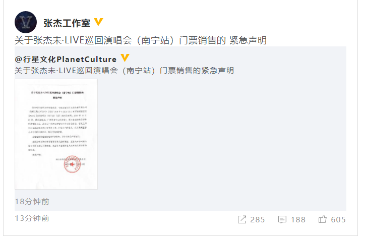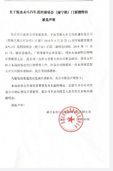 張杰工作室發布關于未·LIVE巡回演唱會(南寧站)門票銷售的緊急聲明