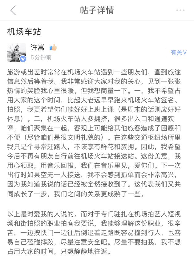 許嵩發(fā)文談粉絲接送