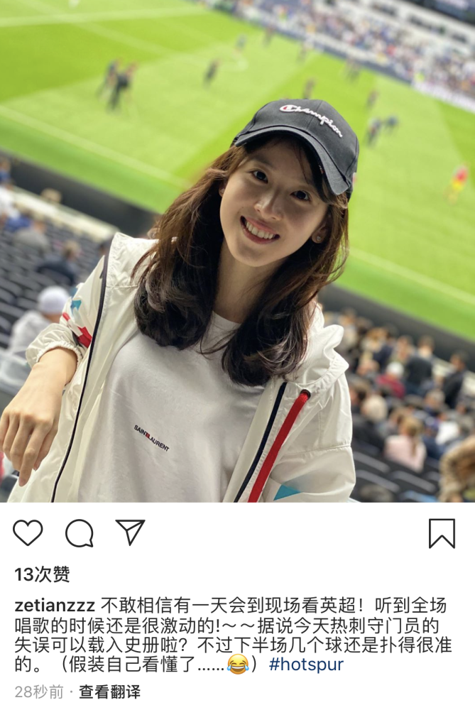 北京時間9月28日晚是英超比賽日,熱刺對南安普頓。據悉,奶茶妹妹進場的時候,就已經被網友發現了,并拍下了照片。就在當天晚上10點左右,網友發布微博,公開了小天的兩張照片。