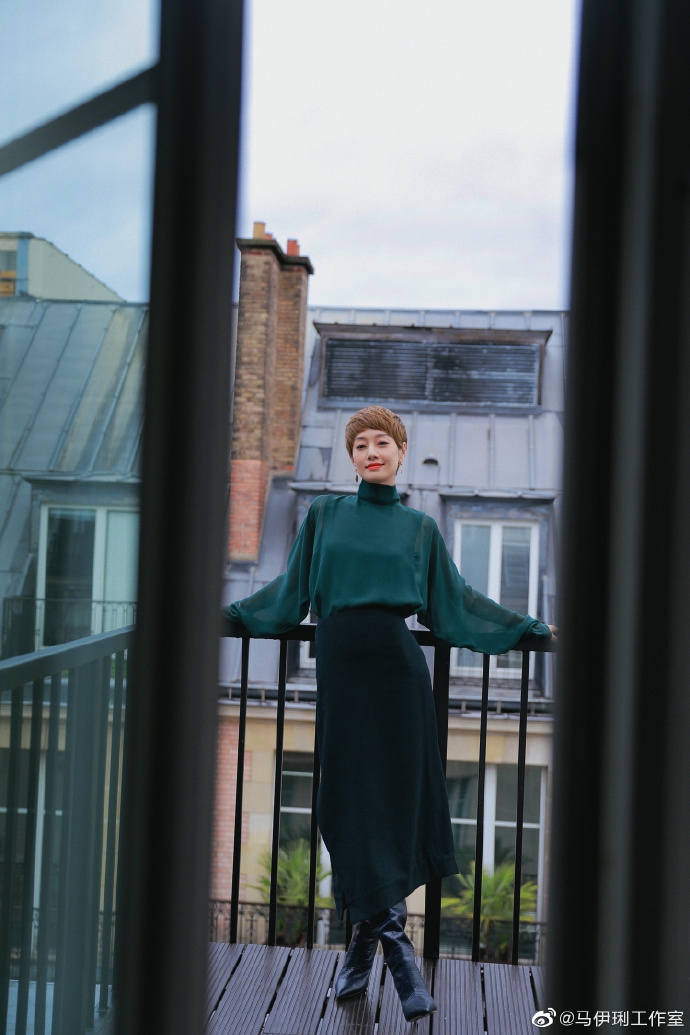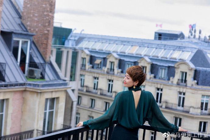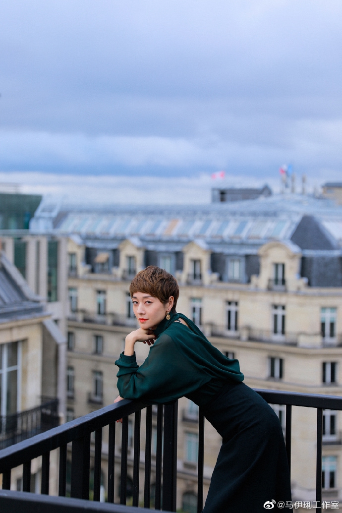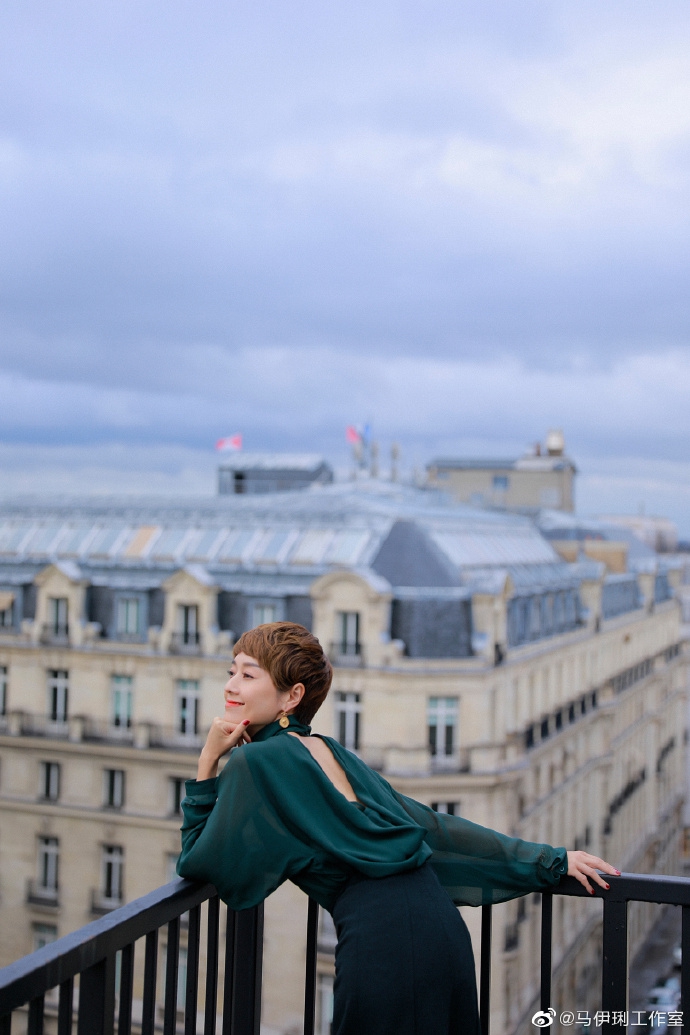 9月29日,馬伊琍工作室曬出一組馬伊琍的照片。照片中,馬伊琍一頭干練短發妝容精致,身穿黑色緊身裙配墨綠色雪紡露背衫,身子傾靠著欄桿笑容甜美燦爛,氣質優雅好身材盡顯。