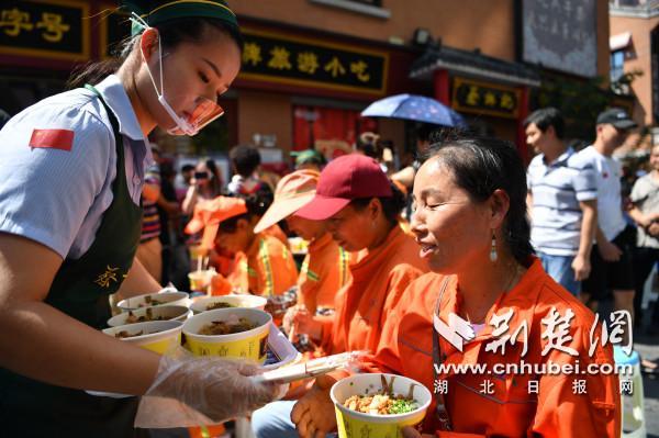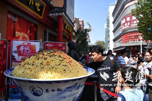 正當大家還沉浸在濃濃的節日氛圍中時,一個超級“海碗”突然出現在眾人面前,引發熱烈歡呼,這是武漢著名老字號品牌蔡林記為新中國生日獻上的一份特別禮物——國慶面。