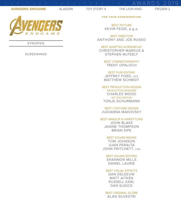 迪士尼為頒獎季而設的“供你參考”網站,公布了計劃為《復聯4》沖奧的計劃