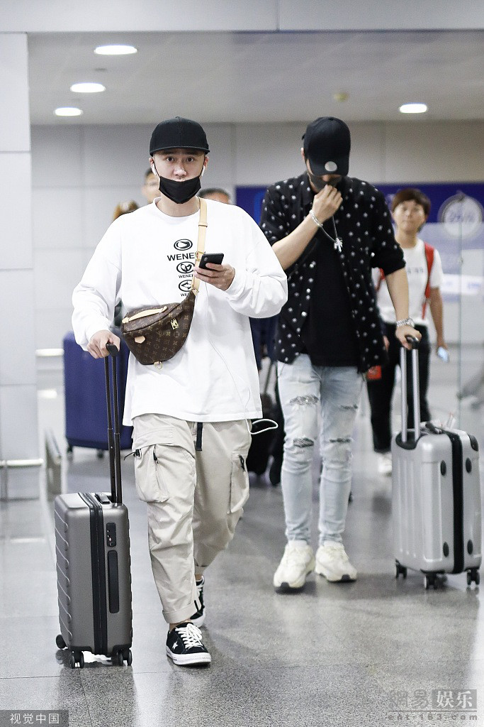 2019年10月3日,上海,蔣勁夫現身機場。他身穿白色衛衣搭配工裝褲,單手插兜趕路,口罩遮面自推行李腳步匆匆。