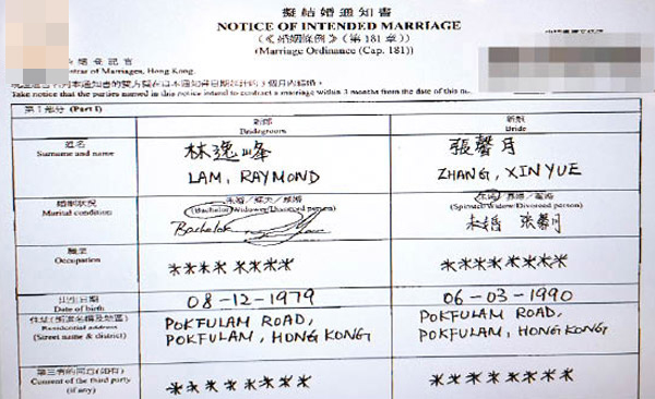 雖然當(dāng)日林峯透過經(jīng)理人表示:“關(guān)于感情事不會作出任何回應(yīng)”,但“身體卻很誠實(shí)”的他已付諸行動,于上月26日在港秘密入紙排期注冊結(jié)婚,與計(jì)劃12月“做老襯”的傳聞不謀而合!其擬結(jié)婚通知書亦正式曝光,當(dāng)中見到林峯以本名林逸峰入紙,而張馨月的出生日期顯示為1990年3月6日,與網(wǎng)上資料顯示的1990年9月18日有出入,相差半年。至于二人的住址同樣報(bào)稱位于薄扶林,可見張馨月已由去年入往的帝景園,搬到林峯于2015年以逾6千萬港幣購入的薄扶林嘉林閣複式單位,共筑愛巢。