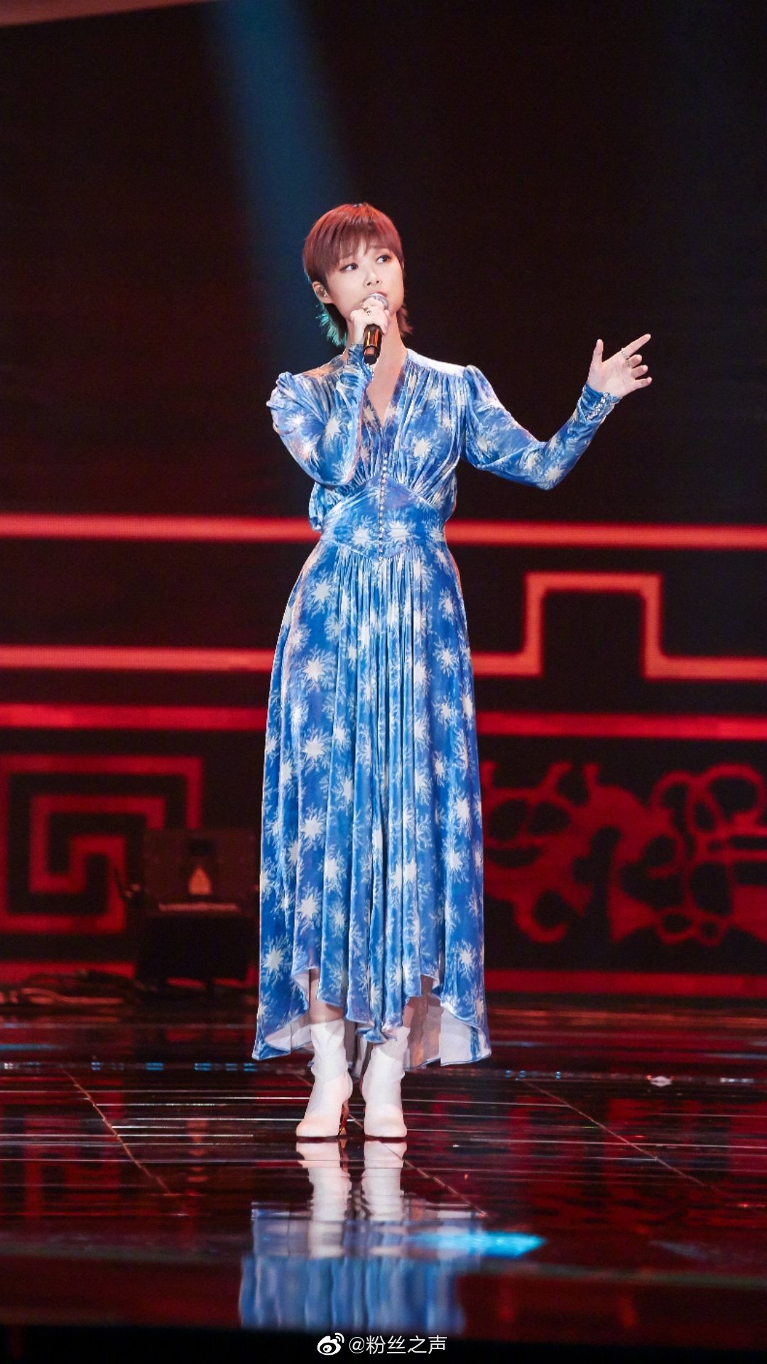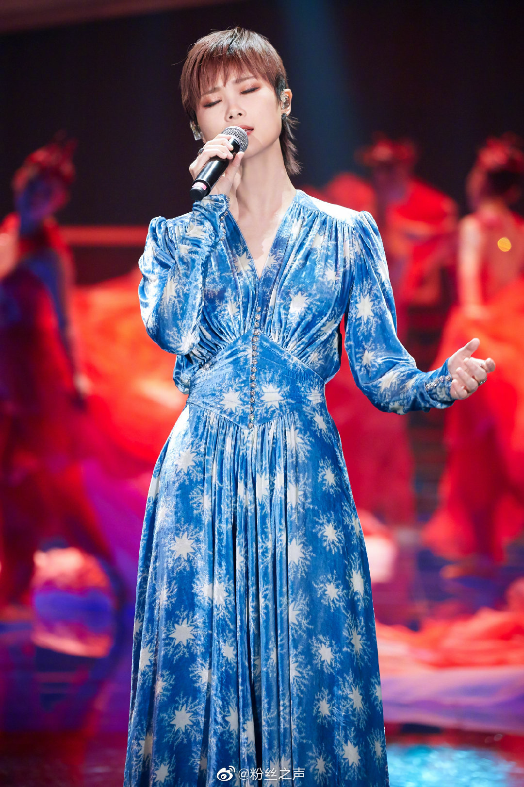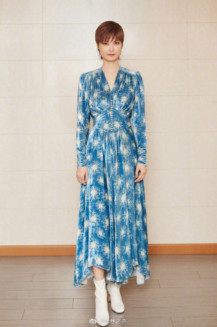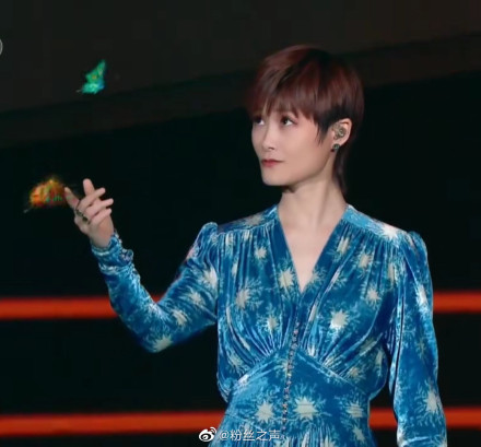 4日晚,李宇春亮相央視晚會,難得穿上了一襲藍色絲絨長裙,收腰款式配上星光圖案,清爽又閃亮,凸顯女性魅力。