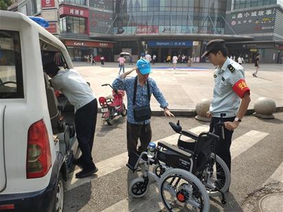 26日,武漢市東西湖區吳家山街的毛爹爹開著電動輪椅車外出買藥,返回途中,輪椅車沒電了,進退不得。老人向一輛路過的城管巡邏車呼救,城管隊員將其安全送回家。為表謝意,老人堅持從輪椅上站起來,向城管隊員莊重地敬了個禮。