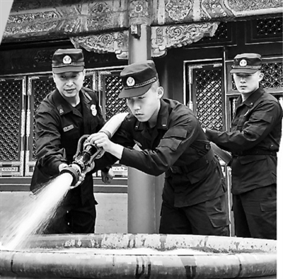 蔡瑞說,故宮消防工作的重點在于“防”。時至今日,蔡瑞帶領隊員們仍保持著“冬鑿冰、夏注水、春除草、秋清葉”的傳統,備足水源,消除火患。在冬天零下十余攝氏度的天氣里,蔡瑞和隊員們將結冰的水面鑿出窟窿,確保在危機時刻能夠就近取水。而在夏季,中隊要確保故宮內未開放區域的水缸注滿水。春秋兩季,隊員則在隨時清除雜草和落葉,每年清理可燃物達幾十噸。