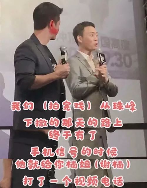 網易娛樂10月9日報道 近日,在《攀登者》的路演途中,張譯曝光一件關于吳京與媳婦謝楠的事情。張譯透露,曾與吳京一起在珠峰拍戲時,下撤的途中終于有了信號,吳京第一時間就拿起手機給謝楠打視頻電話,一是報平安,二是與媳婦進行甜蜜聊天,聊天的內容也極為肉麻,同車的張譯聽后一度想跳車,他們聊的大體內容是一起約定有時間登珠峰。張譯提到這段時忍不住吐槽他們小兩口太親密,言語中充滿了“嫌棄”與羨慕。而吳京也害羞地笑著不說話,沒想到錚錚鐵漢也有柔情似水的一面。