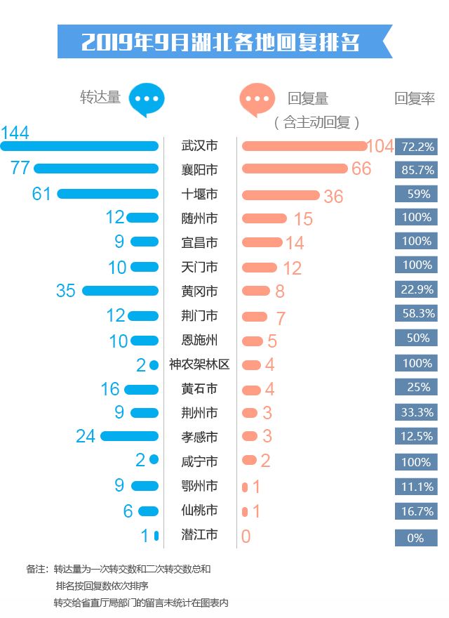 9月1日至30日,《民生熱線》共收到省內(nèi)各地網(wǎng)民留言382條,欄目組已向相關(guān)部門轉(zhuǎn)達(dá)留言共 443條,含二次轉(zhuǎn)交留言74條(荊楚網(wǎng)《民生熱線》欄目正在將此前未回復(fù)的留言進(jìn)行二次轉(zhuǎn)交),共有286條留言得到了及時(shí)回復(fù)(含10條主動(dòng)回復(fù))。其中,隨州市、宜昌市、天門市、咸寧市、神農(nóng)架林區(qū)回復(fù)率為100%。截至2019年9月30日,仍有部分網(wǎng)友留言尚未得到相關(guān)部門回復(fù)。部分問(wèn)題,因涉及事項(xiàng)較重大且復(fù)雜,相關(guān)部門仍在進(jìn)一步調(diào)查處理中,如有回音,請(qǐng)?jiān)凇睹裆鸁峋€》《荊楚問(wèn)政》中及時(shí)給予回復(fù)。