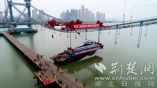 楚網客戶端-荊楚網消息(記者趙秀琳 通訊員葛利龍 劉浪 )10月9日上午,由中交二航局承建的龐公大橋主橋加勁梁順利完成首片吊裝,標志著漢江首座三塔懸索橋進入關鍵的主橋架梁施工新階段,預計今年年底實現全橋貫通。