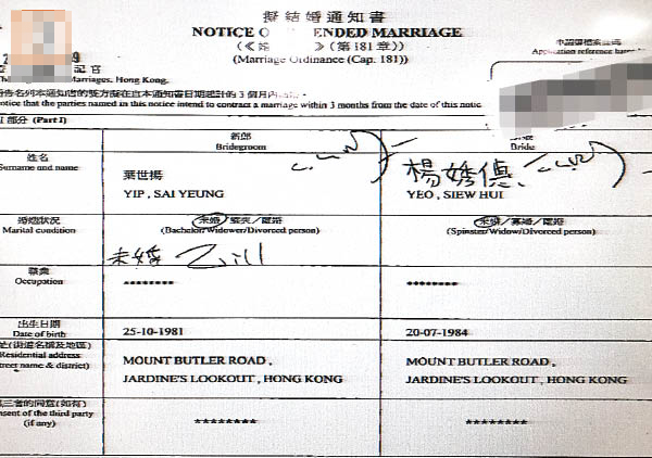 據港媒報道,楊秀惠自從拍完《大帥哥》,已和男友積極籌備婚禮,并做足保密工夫,于今年初在外地秘密結婚,并于上月在香港正式入紙申請注冊。兩人于上月24日正式遞交擬結婚通知書,她以原名楊(女秀)僡登記,而丈夫名字葉世揚正式曝光,比女方年長3歲,二人同報住渣甸山畢拉山道,但沒有申報職業一欄。
