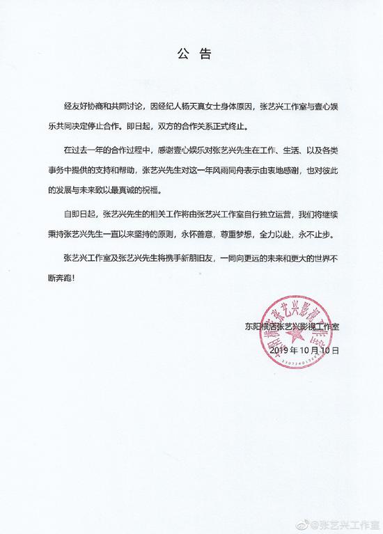 在楊天真發文之后,張藝興工作室也隨后發布聲明宣布因楊天真身體原因與壹心娛樂停止合作,并感謝壹心娛樂在合作時的照顧與幫助。