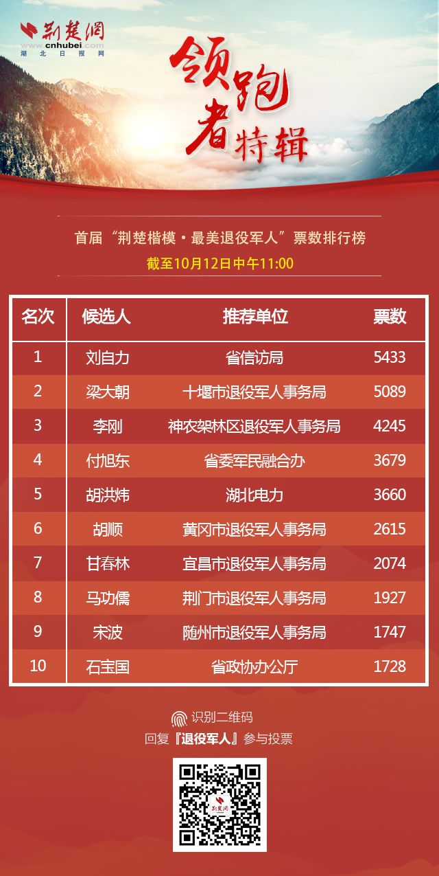 荊楚網客戶端—荊楚網消息(記者肖慧婷)退役不褪色,建功新時代。首屆“荊楚楷?!ぷ蠲劳艘圮娙恕本W絡投票活動自10月10日啟動以來,吸引了全省各界人士的廣泛參與和關注。截至10月12日中午11:00,網絡投票總票數近6萬票,閱讀量超40萬。
