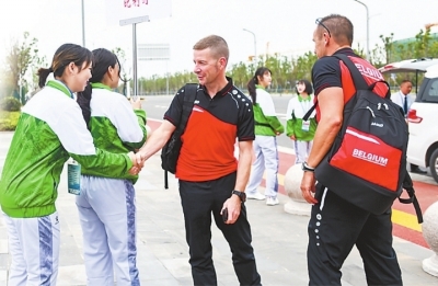 志愿者迎接比利時代表團部分成員