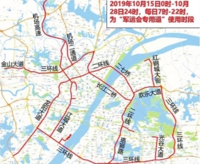 10月15日至28日每日7時至22時,“軍運會專用道”僅允許持有“軍運會專用車輛通行證”的車輛及執行任務的警車、消防車、救護車、工程救險車通行,市民如駕駛機動車出行,請勿占用“軍運會專用道”行駛。