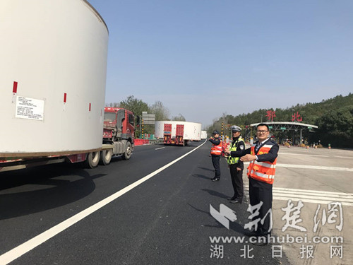 京珠路政、高速交警護送11輛超限運輸車駛出湖北高速。