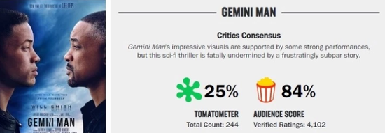 網易娛樂10月17日報道 由李安執導、威爾·史密斯主演的科幻動作大片《雙子殺手》,在上映前備受期待,但在北美上映后反響卻并不理想,目前該片在爛番茄網站的好評率只有25%,進入“爛片”的行列。在票房方面,自從10月11日在美國上映以來,該片的首周末票房只有2050萬美元,這不但比不上已經上映兩周的《小丑》,甚至還比不上格雷格·蒂曼執導的動畫片《亞當斯一家》。多家外媒直言《雙子殺手》大概率會賠錢。