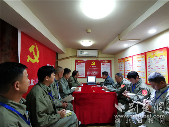 荊楚網客戶端—荊楚網消息(記者張城 通訊員畢紅續、張博正)“今天的夜課堂學習分為兩個部分,一個是學習《習近平關于“不忘初心、牢記使命”論述摘編》,再一個我們把《輸電線路巡查方法》重溫一遍。”10月19日晚,位于武漢經濟技術開發區的凱賓商務賓館里,軍運保電沌口三區第一黨總支部第四支部全體人員正專心地上著黨課,盡管現場條件有些簡陋,但并不妨礙他們的正常學習。