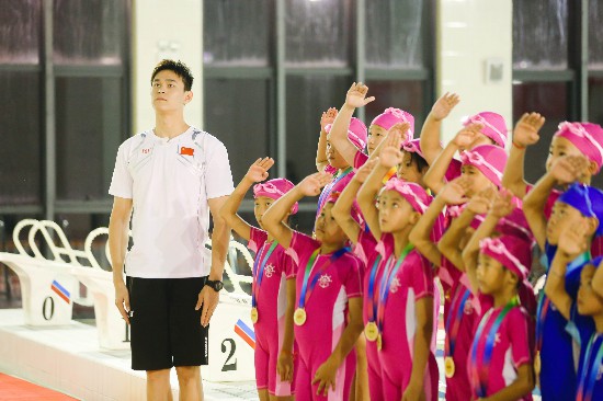 值得一提的是,孫楊還帶領學生們來到國家游泳訓練基地進行了一場游泳“比拼”。躍入水中的孫楊首先向學生們示范了游泳的標準動作,一時間惹得臺上的小學生們驚叫連連,戲稱孫楊是有著六塊腹肌的“美男魚”。隨后的游泳比拼中,紅隊的小隊員突遇大腿抽筋,孫楊暖心上前按摩,詢問情況。雖然最后他輸了比賽,但孫楊向學生們強調道,比賽重要的不是名次,而是拉近彼此間的距離、互幫互助。