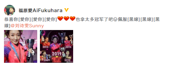 網(wǎng)易娛樂10月22日報道 10月22日早,福原愛發(fā)博恭喜昨晚獲得世界杯女單冠軍的劉詩雯:“恭喜你,也拿太多冠軍了吧,佩服!”據(jù)悉,劉詩雯在2019年女乒世界杯決賽中奪得冠軍,這是她第五次斬獲世界杯女單冠軍,也因此成為世界杯歷史上第一位“五冠王”。