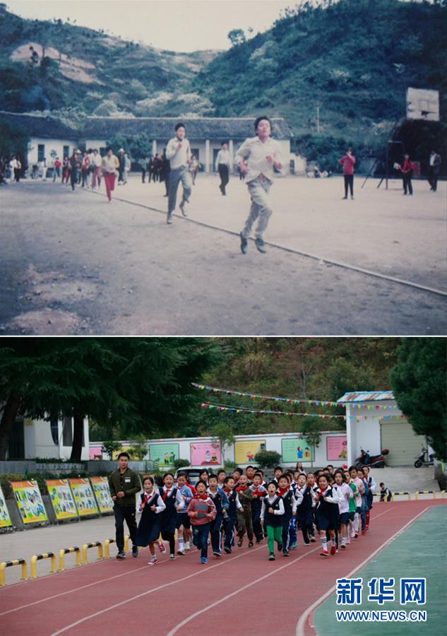 拼版照片:上圖為羅田縣希望小學的資料照片;下圖為10月11日清晨,羅田縣希望小學學生在老師的帶領下晨跑。(新華社記者姚琪琳攝)新華社發