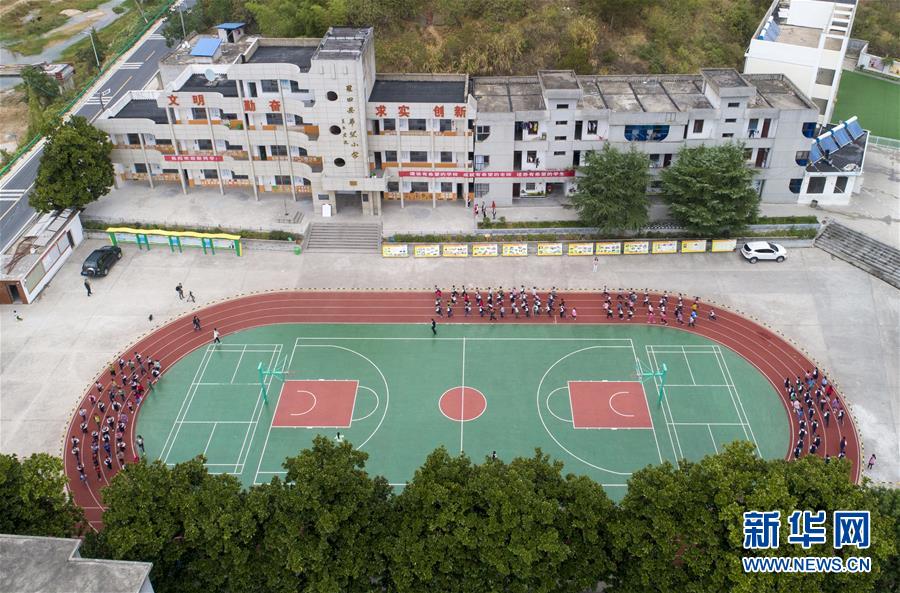 羅田縣希望小學學生在老師的帶領下晨跑(10月11日無人機拍攝)。新華社記者 熊琦 攝