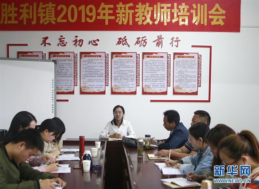 湖北省羅田縣勝利鎮2019年新教師培訓會在羅田縣希望小學舉行,方榮(中)在培訓會上與新教師座談(10月11日攝)。新華社記者 姚琪琳 攝
