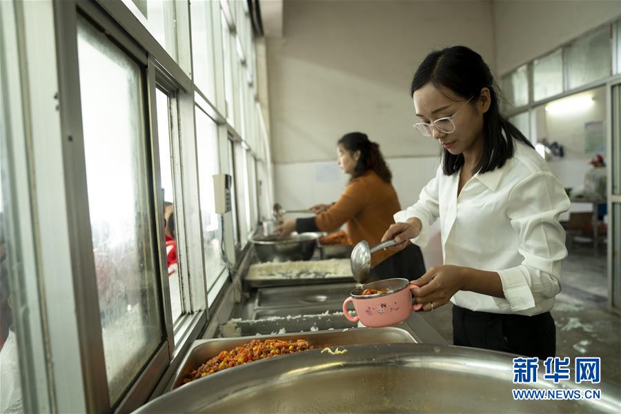 方榮在羅田縣希望小學食堂給學生打飯(10月11日攝)。新華社記者 熊琦 攝