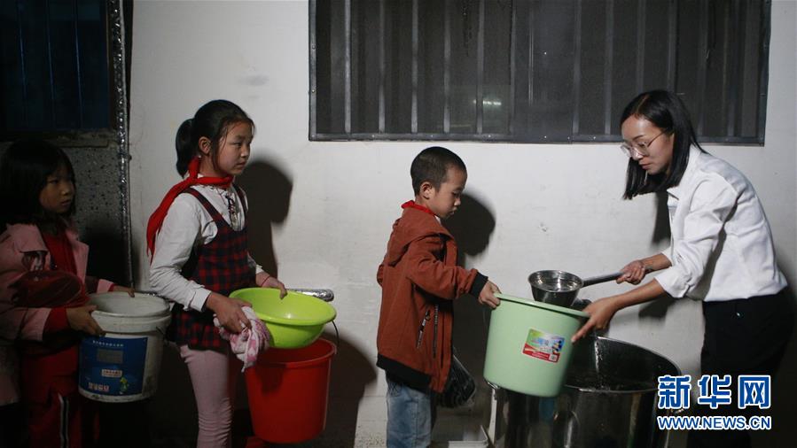 夜晚,方榮給羅田縣希望小學住校學生打水洗漱(10月10日攝)。新華社記者 姚琪琳 攝