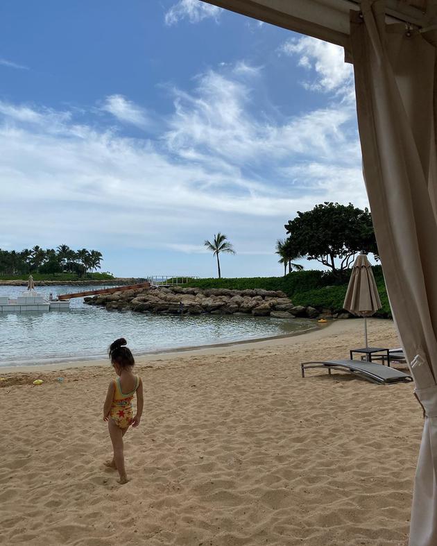 網易娛樂10月22日報道 10月22日,陳冠希在個人社交網站上分享帶女兒沙灘度假的照片,照片中Alaia穿連體泳衣,雙腳交叉站在沙灘上,扎丸子頭背影呆萌可人。