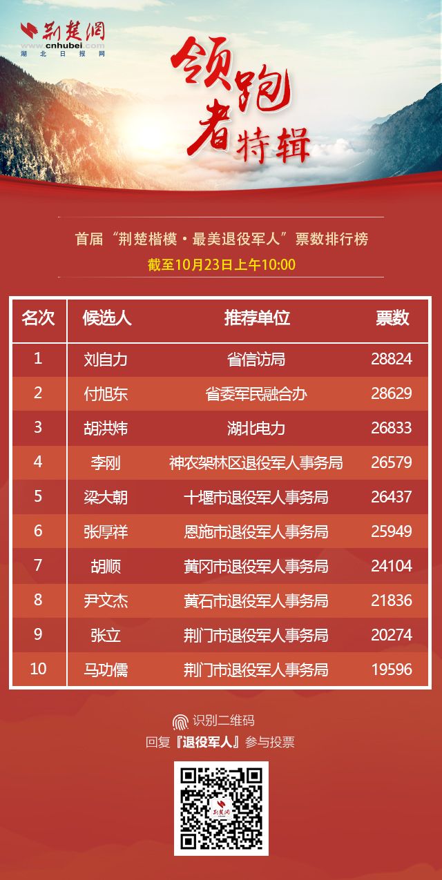 荊楚網(wǎng)客戶端—荊楚網(wǎng)消息(記者肖慧婷)退役不褪色,建功新時代。由湖北省委宣傳部、省委直屬機關工委、省退役軍人事務廳、省軍區(qū)政治工作局主辦的首屆“荊楚楷模·最美退役軍人”網(wǎng)絡投票活動已經(jīng)進入倒計時。截至10月23日中午12時,網(wǎng)絡投票總票數(shù)近40萬,閱讀量超170萬。距離投票截止還有1天,最新的票數(shù)排名情況如何?本次領跑者榜單又有什么新的變化?